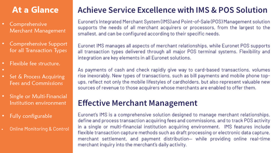 Transform Merchant Acquiring with Euronet’s Integrated Merchant System (IMS) & Point-of-Sale Management Euronet’s IMS &